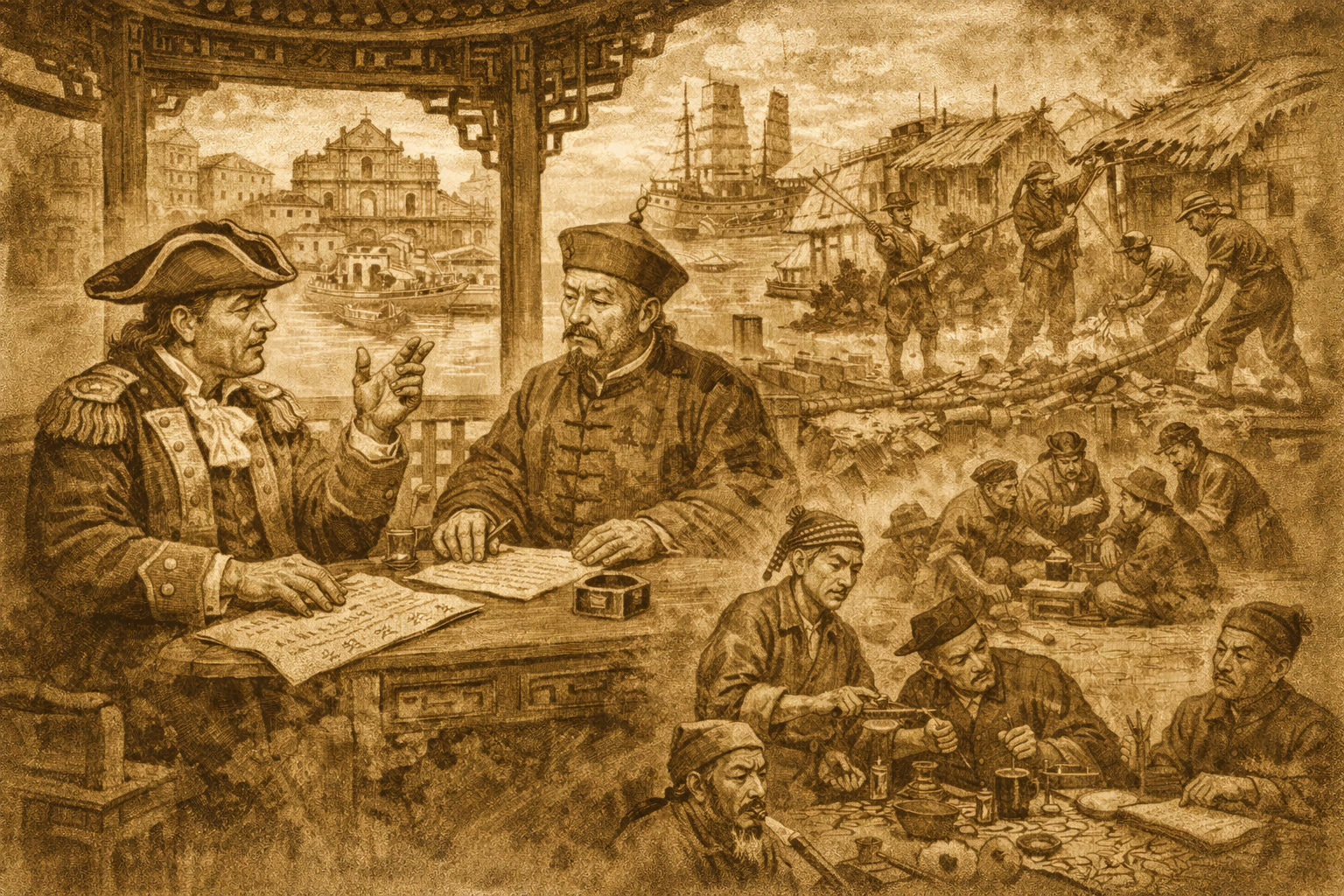 Imagina-se tão árdua arte de cobrar impostos sobre um produto de contrabando, aplicando a lei a um ópio interdito que depois continuava viagem para ser distribuído pelo litoral do Império da China. Imagina-se também a teia tecida entre a Índia e Macau, principalmente por comerciantes ingleses como James Matheson, nome bem conhecido nestas lides; a Casa Comercial Magniac & Companhia; e, ainda, aqueles que, mantendo nome português – Rogério de Faria & Companhia – optaram pela nacionalidade britânica, de certo em favor de melhores proveitos. Todos eles bem relacionados entre si, a pugnar pela causa comum de fugir ao pagamento dos direitos alfandegários previstos na passagem pela rada de Macau.
