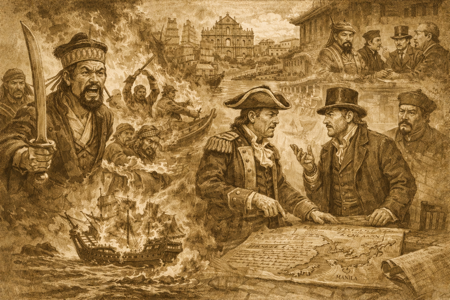 Alianças entre impérios, celebradas pelas graças das vis ações dos piratas que teimaram, ao longo dos séculos, em vaguear e saquear os mares do sul da China.